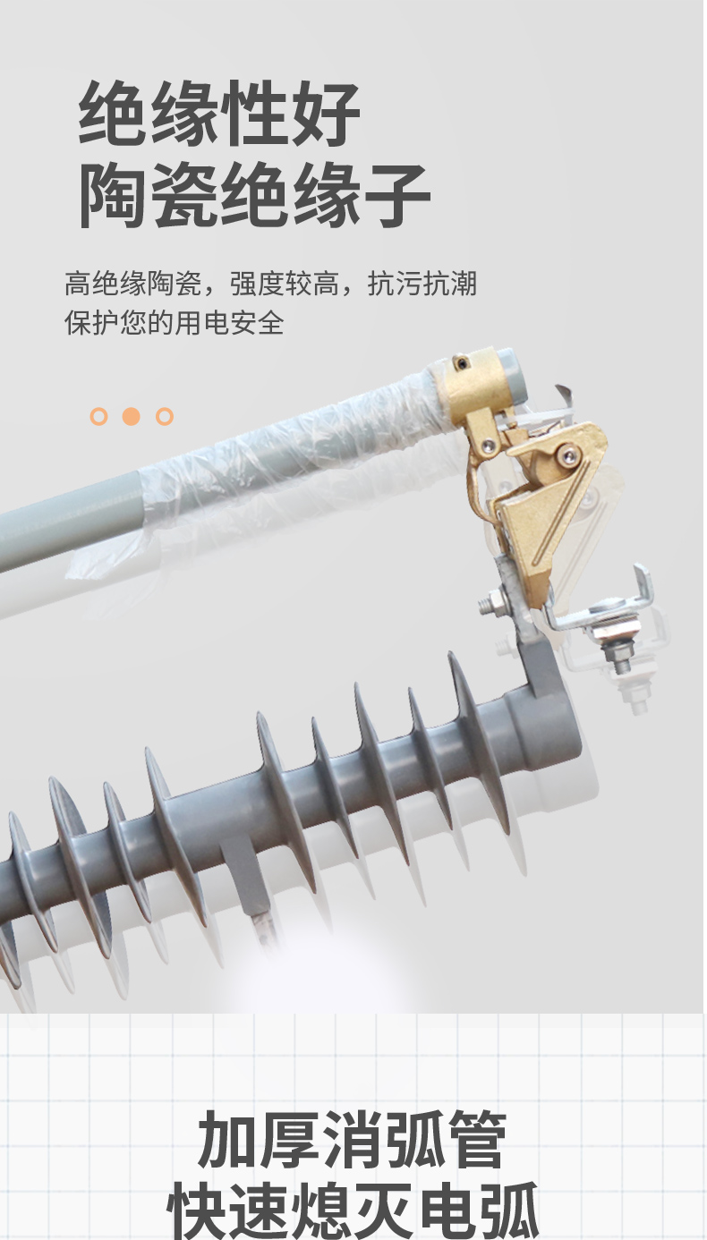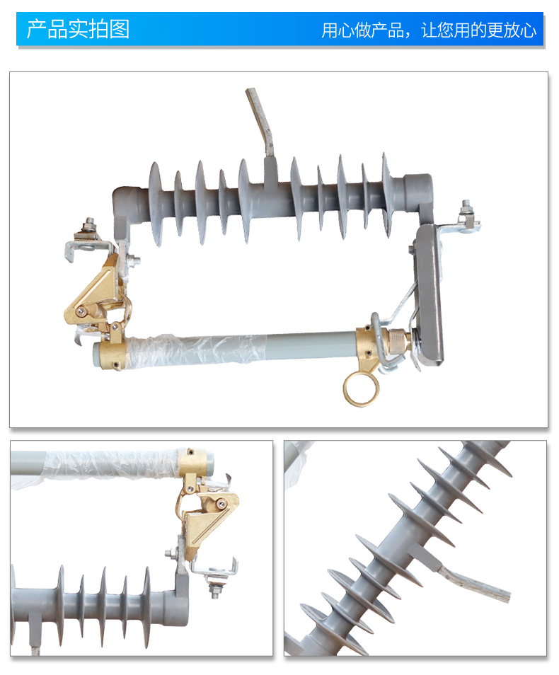 跌落式熔斷器在正常運(yùn)行時,熔絲管借助熔絲張緊后形成閉合位置。當(dāng)系統(tǒng)發(fā)生故障時,故障電流時熔絲迅速熔斷,并形成電弧,消弧管受電弧灼熱,分解出大量的氣體,使館內(nèi)形成很高壓力,并沿管道形成縱吹,電弧被迅速拉長而熄滅。熔絲熔斷后,下部動觸頭失去張力二下翻,鎖緊機(jī)械,釋放熔絲管,熔絲管跌落,形成明顯的開斷位置。當(dāng)需要拉負(fù)荷時,用絕緣桿拉開動觸頭,此時主動、靜動觸頭仍然接觸,繼續(xù)用絕緣桿拉動觸頭,輔助觸頭也分離,在輔助觸頭之間產(chǎn)生電弧,電弧在滅罩狹縫中被拉長,同時滅弧罩產(chǎn)生氣體,在電流過零時,將電弧熄滅。二、用途